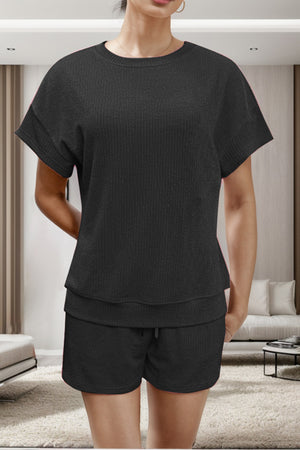 Double Take Texture Half Sleeve T-Shirt and Drawstring Shorts Set