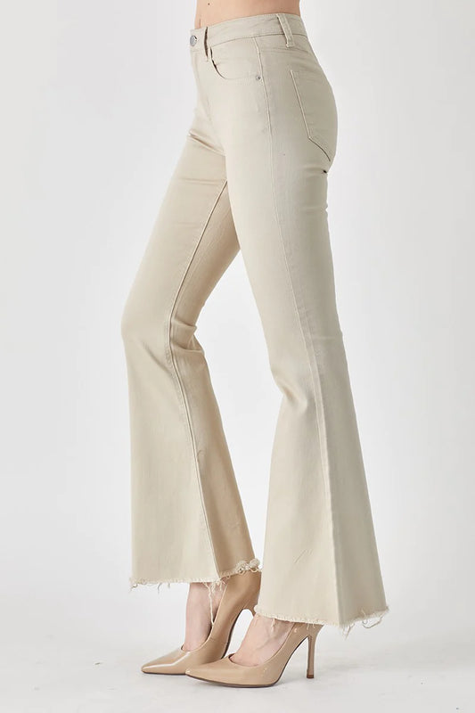 RISEN Mid-Rise Raw Hem Flare Jeans in Khaki (sz 9)