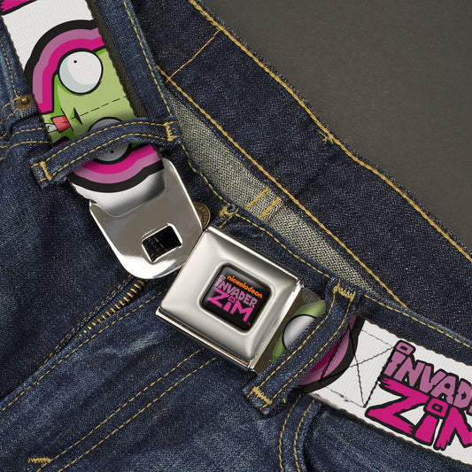 INVADER ZIM Title Logo Full Color Pink/Green Seatbelt Belt - INVADER ZIM Title Logo and GIR Pose Close-Up White/Pinks Webbing
