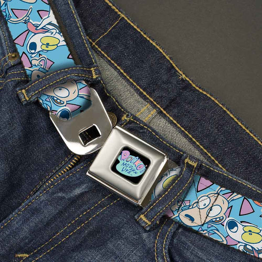 ROCKO'S MODERN LIFE Logo Full Color Black/Blues Seatbelt Belt - Rocko & Spunky Scattered Expressions/Triangles Blue/Lavender Webbing
