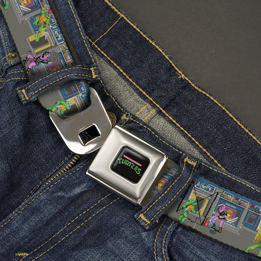 TEENAGE MUTANT NINJA TURTLES Logo Full Color Black Seatbelt Belt - Teenage Mutant Ninja Turtles Battle Purple Foot Soldier Ninja Arcade Scene Grays Webbing