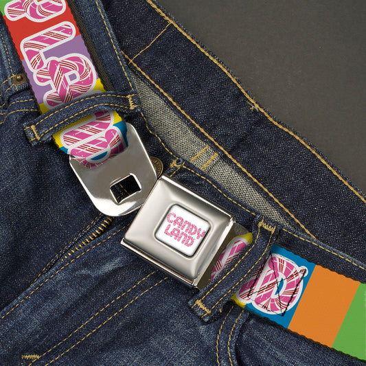 CANDY LAND Game Logo White/Pink Seatbelt Belt - CANDY LAND Game Logo Color Blocks Multi Color Webbing