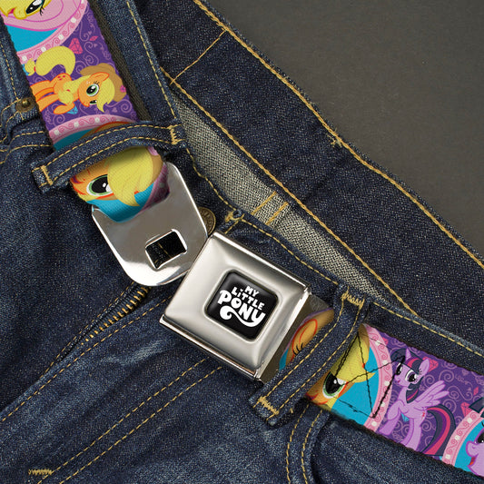 MY LITTLE PONY Title Logo Full Color Black/Purple/White Seatbelt Belt - My Little Pony Mane Six Close-Up Faces and Poses Purples/Pinks Webbing