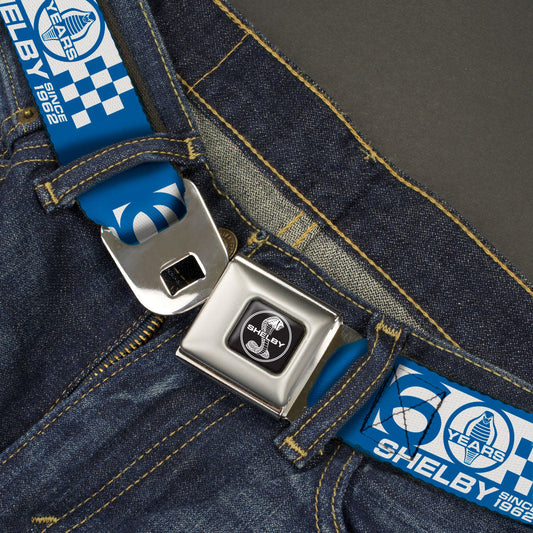 SHELBY Tiffany Split Full Color Black/White Seatbelt Belt - SHELBY 60 YEARS SINCE 1962 Checker Blue/White Webbing