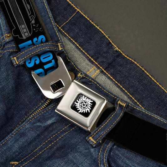Winchester Logo Full Color Black White Seatbelt Belt - SUPERNATURAL-JOIN THE HUNT/Winchester Pentagram Grays/Black Webbing