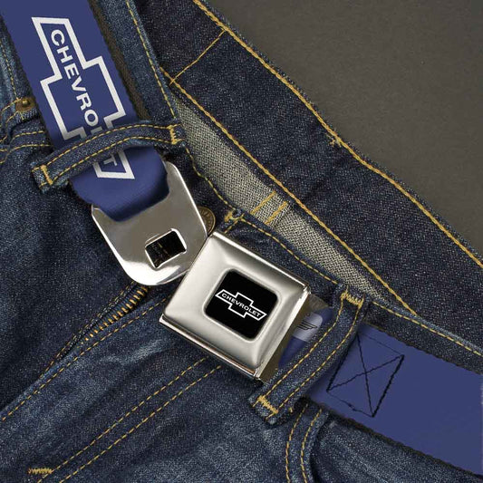 1965 CHEVROLET Bowtie Full Color Black White Seatbelt Belt - 1965 CHEVROLET Bowtie Blue/White Webbing