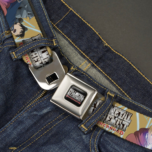 FULLMETAL ALCHEMIST BROTHERHOOD Title Logo Full Color Black Seatbelt Belt - Fullmetal Alchemist Brotherhood Elric Brothers and Roy Mustang Pose Yellows Webbing