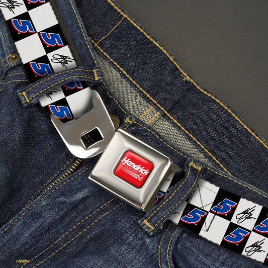 HENDRICK MOTORSPORTS Checker Logo Full Color Red/White Seatbelt Belt - Kyle Larson Autograph and #5 Checker Logo Black/White/Blue/Red Webbing