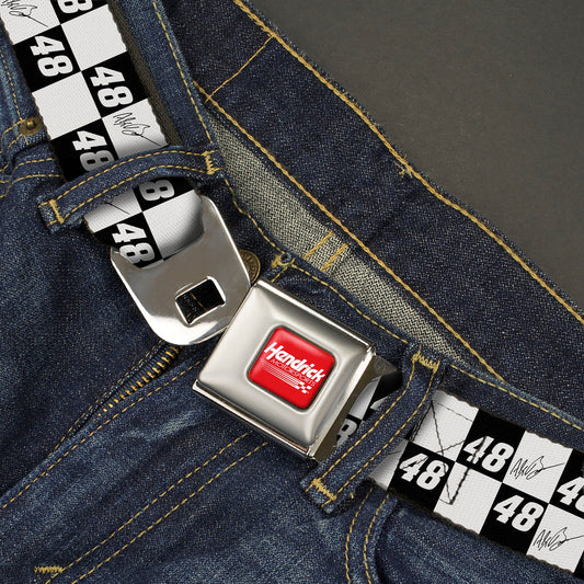 HENDRICK MOTORSPORTS Checker Logo Full Color Red/White Seatbelt Belt - Alex Bowman Autograph and #48 Checker Logo Black/White Webbing