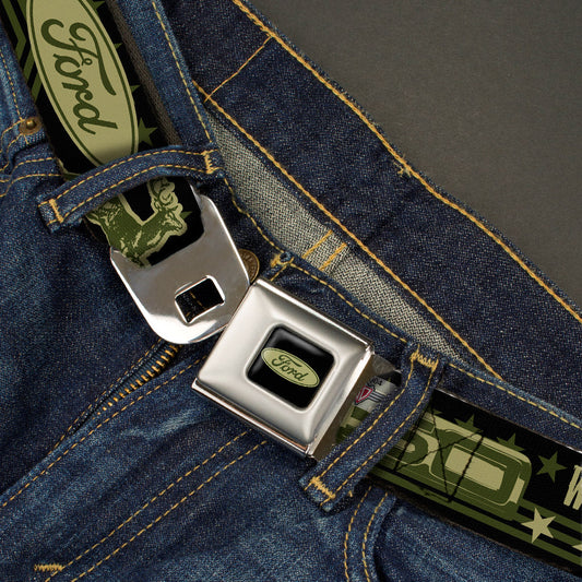FORD Oval Full Color Black Tan Olive Seatbelt Belt - FORD F-150 WORKS HARD, PLAYS HARDER./Stars Black/Tan/Olive Webbing