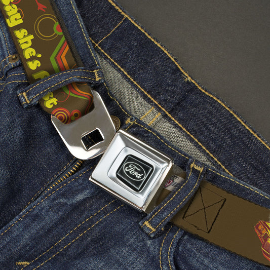 Ford Emblem Seatbelt Belt - Vintage Ford THUNDERBIRD-THEY SAY SHE'S FAST Browns/Yellows Webbing
