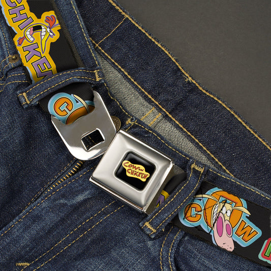COW AND CHICKEN Title Logo Full Color Black Seatbelt Belt - COW AND CHICKEN Title Logo and Poses with RED GUY Black Webbing