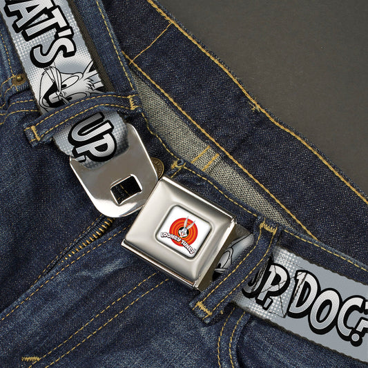 LOONEY TUNES Bullseye Title Logo Full Color White Seatbelt Belt - Bugs Bunny WHAT'S UP DOC? Pose and Text Grays Webbing
