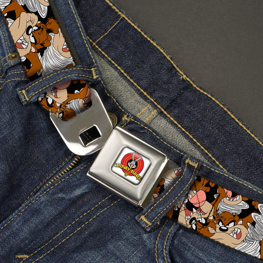 Looney Tunes Logo Full Color White Seatbelt Belt - Tasmanian Devil Vortex Poses Stacked Black Webbing