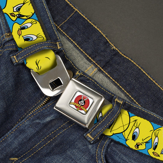 Looney Tunes Logo Full Color White Seatbelt Belt - Tweety Bird CLOSE-UP Expressions Baby Blue Webbing