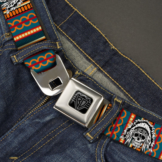 BD Wings Logo CLOSE-UP Black/Silver Seatbelt Belt - Native American Skull/Tapestry Multi Color/White/Black Webbing