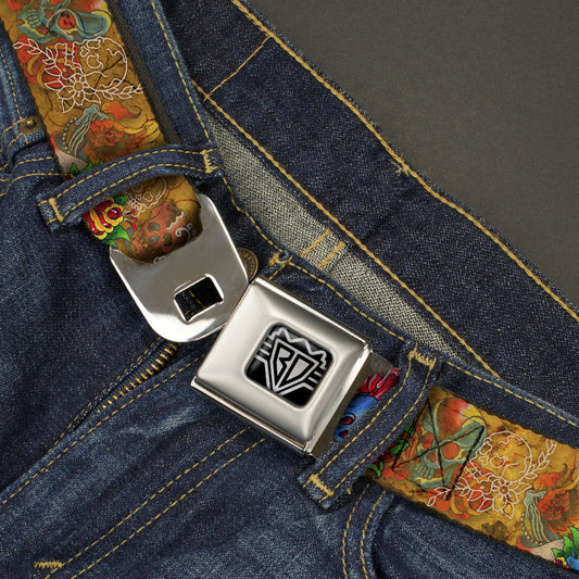 BD Wings Logo CLOSE-UP Black/Silver Seatbelt Belt - Sugar Skulls & Flowers Black/Multi Color Webbing