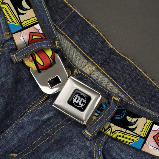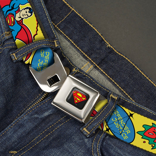 Superman Shield Logo Full Color Black Seatbelt Belt - SUPERMAN Pose Quotes and Icons Collage Yellow/Multi Color Webbing