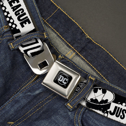 DC Round Logo Black/Silver Seatbelt Belt - JUSTICE LEAGUE Superheroes Retro Pop White/Black Webbing