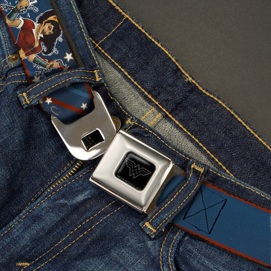Wonder Woman Logo Full Color Red Seatbelt Belt - WONDER WOMAN 4-Poses Skyline & Stars Blues Webbing