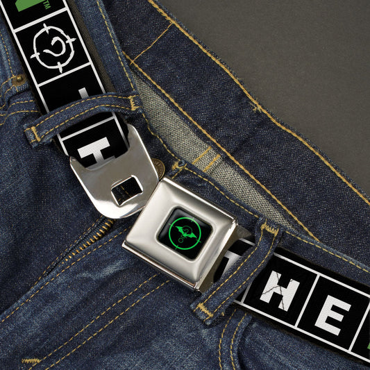 The Batman Movie Batman and Riddler Target Logo Full Color Black/Green Seatbelt Belt - The Batman Movie Crossword Puzzle Black/White/Green Webbing