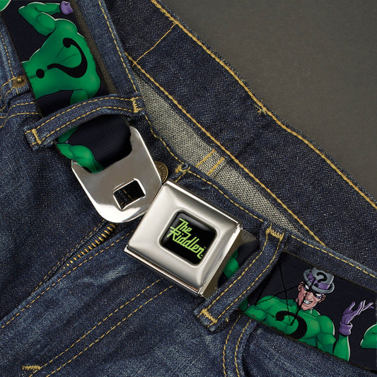 THE RIDDLER Title Log Full Color Black/Green Seatbelt Belt - DC Batman Villain The Riddler Pose Turns Black Webbing