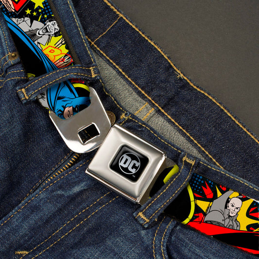 DC Round Logo Black/Silver Seatbelt Belt - Classic Batman/Joker & Superman/Lex Luthor Halftone Black/Blue Webbing