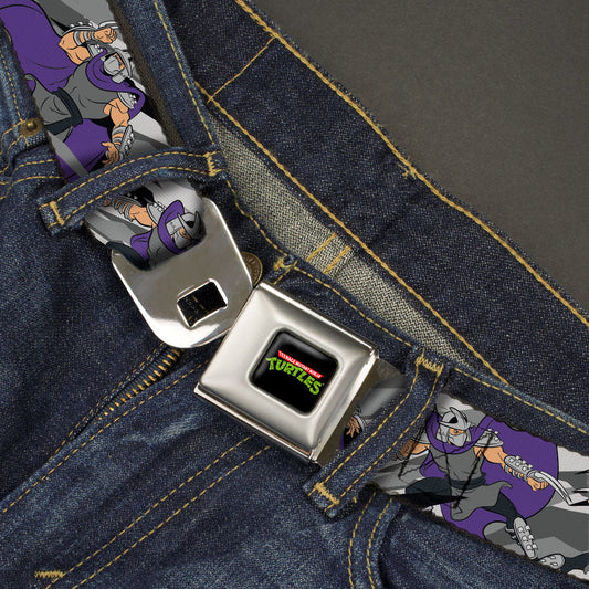 Classic TMNT Logo Full Color Seatbelt Belt - Teenage Mutant Ninja Turtles Shredder Action Poses Grays/Purple Webbing