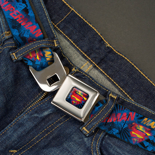 Superman Shield Rays Full Color Black Blue Red Yellow Seatbelt Belt - SUPERMAN MAN OF STEEL Shield Collage/Rays Black/Blues/Reds/Yellows Webbing