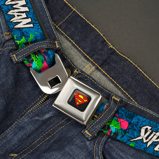 Superman Shield Logo Full Color Black Seatbelt Belt - SUPERMAN Breaking Chains Force for Good Pose and Text Blues Webbing