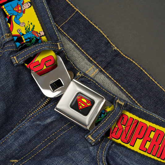 Superman Shield Logo Full Color Black Seatbelt Belt - SUPERMAN Action Poses and Text Yellow/Red Webbing