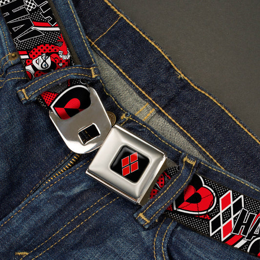 Harley Quinn Diamond Full Color Black Red Seatbelt Belt - Harley Quinn Poses/HAHAHA!/Diamonds/Hearts Halftone White/Black/Red Webbing