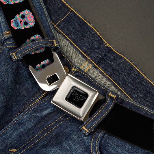 Wonder Woman Black Silver Seatbelt Belt - Wonder Woman Floral Skull Black/Multi Pastel Webbing