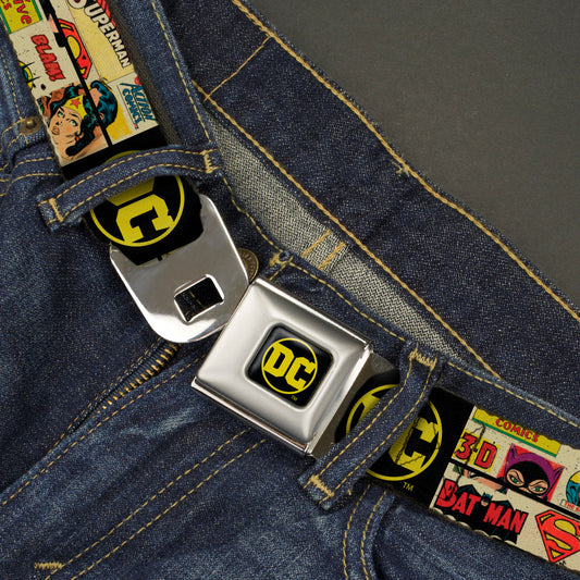 Vintage DC Comics Logo Full Color Black/Yellow Seatbelt Belt - Vintage DC Comics Superhero and Logos Collage Black Webbing