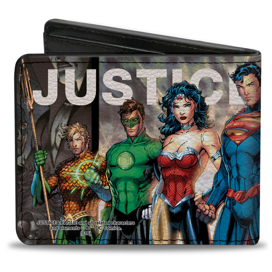 Bi-Fold Wallet - Justice League 4-Superhero Group Pose Splatter + Logo Black Gray Red Multi Color