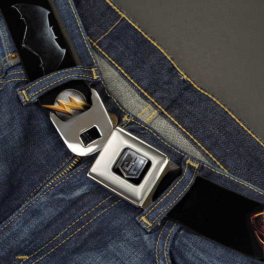 JL 2017 Badge Full Color Black Grays Seatbelt Belt - Justice League 2017 6-Superhero Icons Black Webbing
