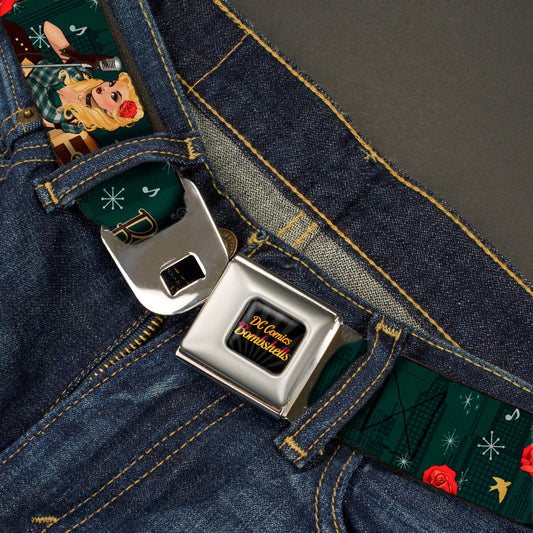 DC COMICS BOMBSHELLS Rays Full Color Black Gray Orange-Red Fade Seatbelt Belt - BLACK CANARY Bombshell Pose/Roses Greens/Reds/Yellow Webbing