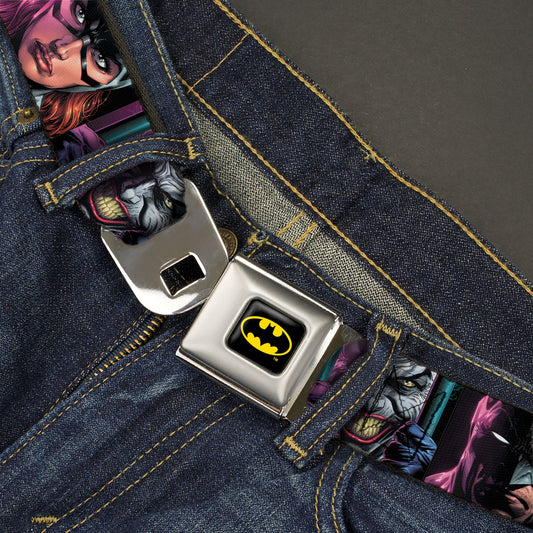 Batman Full Color Black/Yellow Seatbelt Belt - Batman Batgirl and Joker Comic Book Cover Face Close-Ups Black Webbing