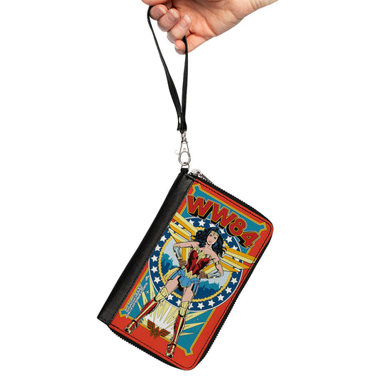 Women's PU Zip Around Wallet Rectangle - Wonder Woman WW84 Standing Pose Stars Reds Yellows Blues