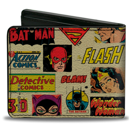 Bi-Fold Wallet - DC Comics Retro Superhero Faces and Logos Collage Ivory