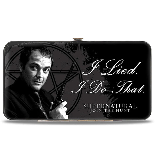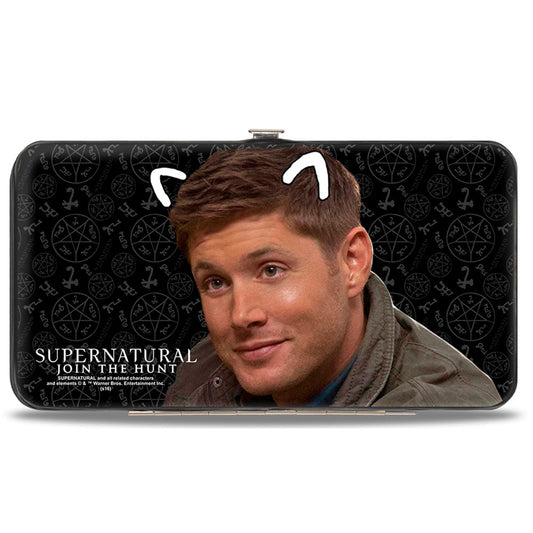 Hinged Wallet - SUPERNATURAL Sam Moose + Dean Sqirrel Poses Scattered Symbols Black Gray White