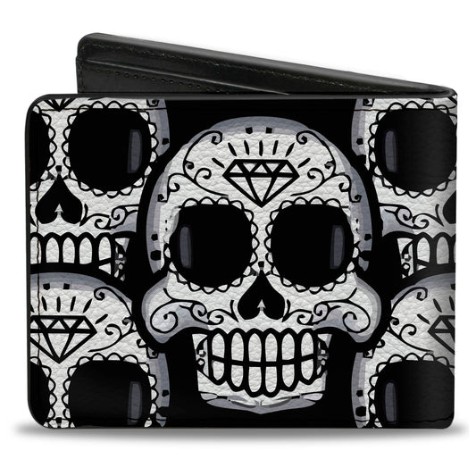 Bi-Fold Wallet - Cartoon Sugar Skulls Stacked Black White