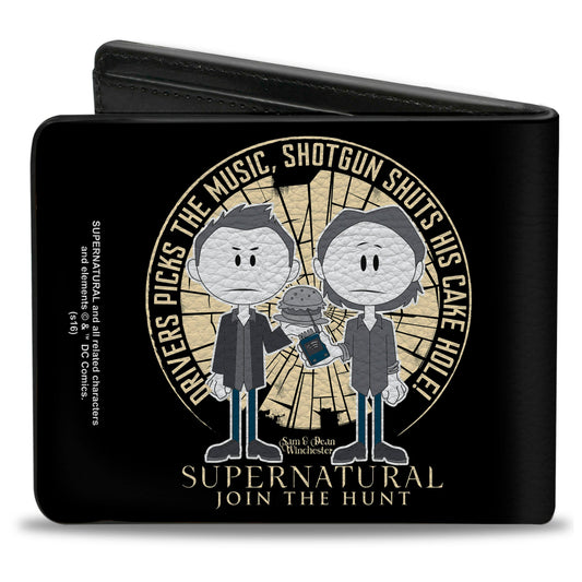 Bi-Fold Wallet - Supernatural Sam & Dean Caricatures DRIVER PICKS THE MUSIC Shattered Glass Black White Grays Blues