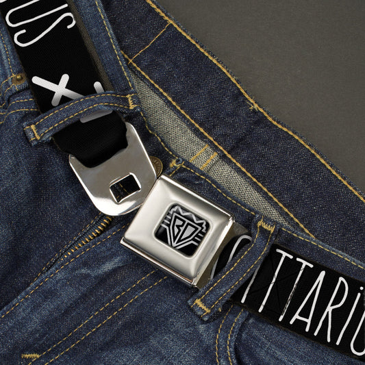 BD Wings Logo CLOSE-UP Full Color Black Silver Seatbelt Belt - Zodiac SAGITTARIUS/Symbol Black/White Webbing
