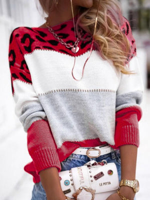 Leopard Color Block Round Neck Long Sleeve Sweater