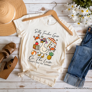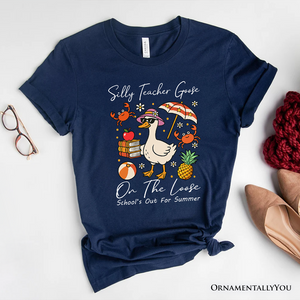 Last Day Teacher Goose T-Shirt, Tropical Summer Break Navy, White, and Natural Tee for Fun and Quirky Educators