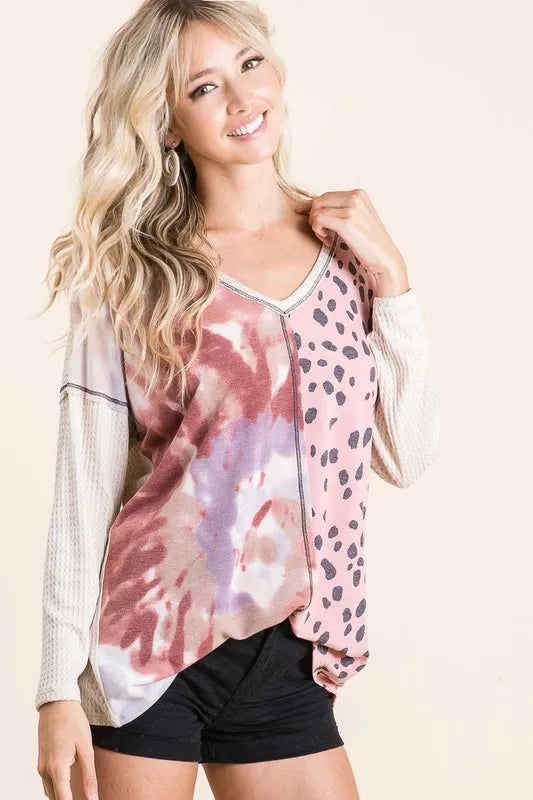 BiBi Tie Dye Terry Top with Color Block Pointelle Knit