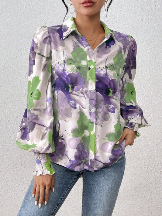Printed Button Up Lantern Sleeve Shirt
