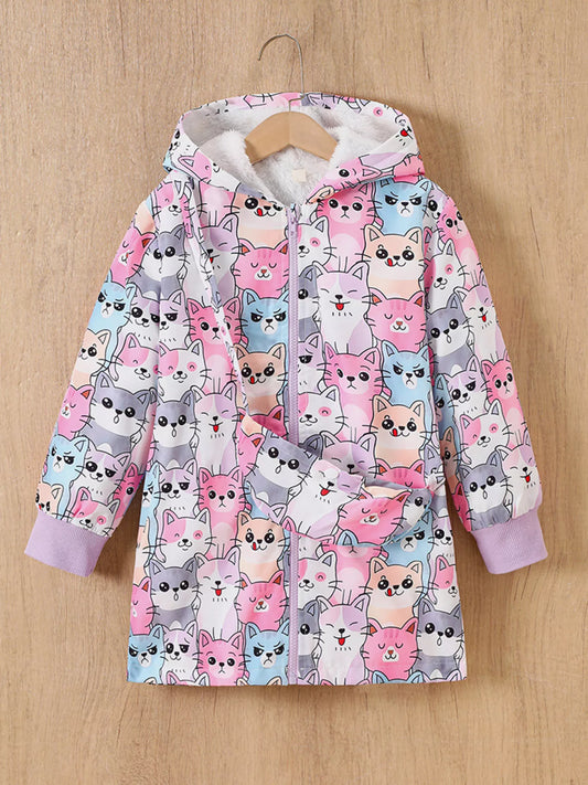 Children's Cute Cartoon Cat Print Fleece Lined Hooded Jacket with Bag