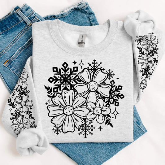 SKETCHED SNOWFLAKE FLORAL SWEATSHIRT W/ SLEEVE PRINT